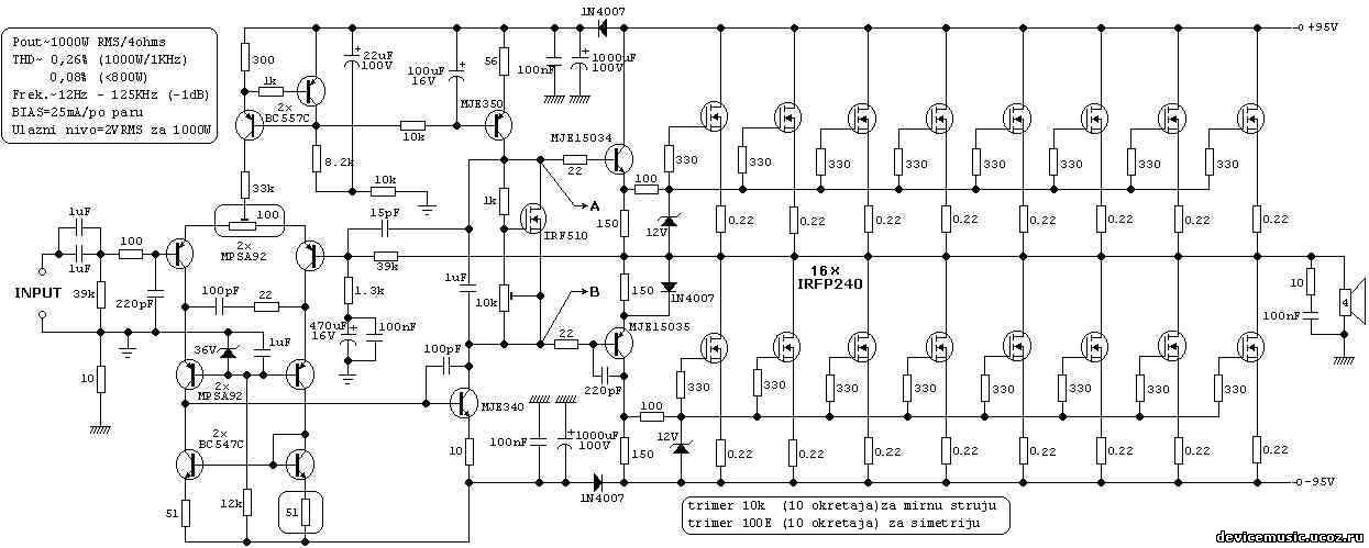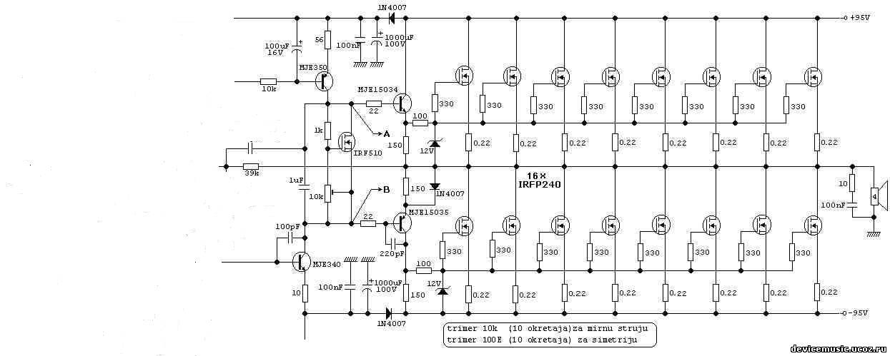 | zdravstvuite mojno li budet esho dobavit 2-3 pari tranzistorov na vixod vsyotaki xotelos bi razognat etot uselitel do 1000W nu estestvenno i uveli4it napryajenie pitaniya i esho vopros k avtoru pridyotca li zamenyat draiverni kaskad na tranzistorax 2sa1380 2sc3502 na bolee moshnie tranzistori mojno li budet ispolzovat vmesto bipolyarnix tranzistorov polevie kakto eto mojet esho blagotvorno skozatca na xarakteristiki uselitelya ? vsyotaki po moei versii raska4at moshni vixodnoi kaskad iz 6-7 IRFP240 ne prostaya zada4a zaranie spasibo