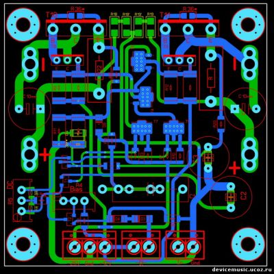 Важно: После проверки и настройки токов и напряжений предварительной части, необходимо эти токи снизить до минимума, подстроечником R5. И только потом подключать выходной каскад, и плавно настраивать его ток покоя. Регулировка тока покоя чувствительна к конвекции в области радиаторов. Окончательную подстройку и проверку необходимо производить с установленными крышками, в полностью собранном корпусе. Контроль за током покоя в этом случае проводится через выведенные сквозь вентиляционные отверстия проводники. В плане размещеня радиаторов - желательно по бокам корпуса, с рёбрами наружу.