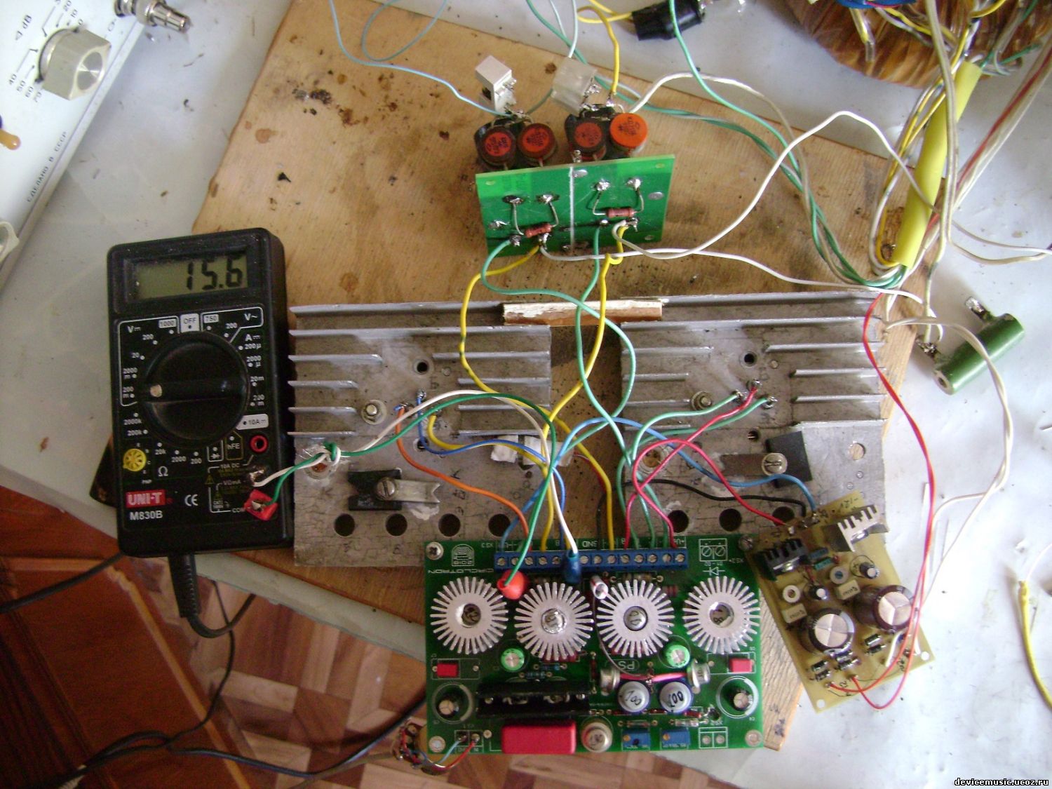 1) R6 - в среднее положение, 2) R5 - на макс. сопротивление , 3) Включаем всё в сборе, но на ВК питание не подаём. 4) После небольшого прогрева ( 5 мин), устанавливаем ноль подстроечником R6 на коллекторах Т4 и Т6 и параллельно уменьшаем R5 до исчезновения "ступеньки" синусоиды и опять проверяем " ноль" на коллекторах. Cкорее всего наоборот, сначала убираем ступеньку и подстраиваем ноль.  4) При помощи генератора и осциллографа смотрим амплитуду на коллекторах Т4 и Т6. Смотрим клиппинг, должна быть симметрия. 5) Подключаем лампы вместо предохранителей(сначала один канал). 6) Подключаем нагрузку на выход усилителя, мощный резистор 10 - 20 Вт на 6 - 8 Ом. 7) Осциллограф подключаем к нагрузке, а мультиметр к резистору 0,1 Ом. Предел мультиметра - 200 мВ. 8) Включаем усилитель, ждём 5 мин., контролируем при нагреве ток покоя, чтобы он не был больше 300 мА(30 мВ). Ток покоя надо настраивать по осциллографу.